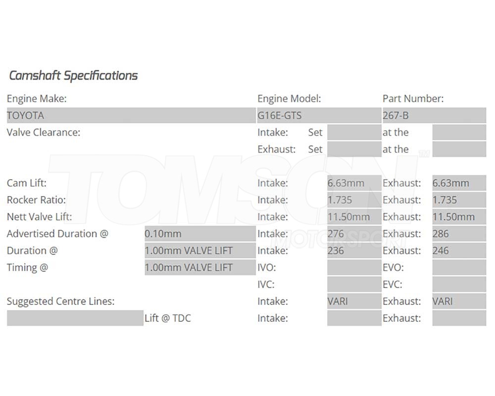 Kelford Cams 267-B camshafts Toyota GR Yaris (Gen 1, Gen 2) (GXPA16), GR Corolla (GZEA14) 1.6 G16E-GTS 276°/286° (hydraulic lifters)