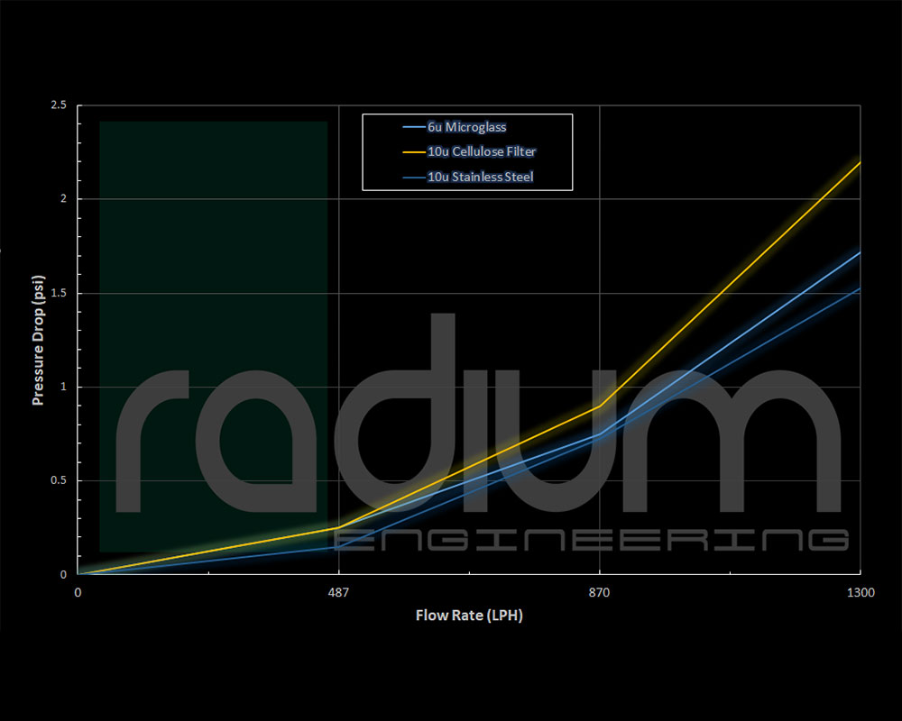 All replacement elements for the Radium fuel filter use anodized aluminum end caps that are laser engraved for easy identification and use an internal FKM O-ring for compatibility with all fuel types. As shown below, they feature a stainless steel internal core to prevent collapsing at high flows.