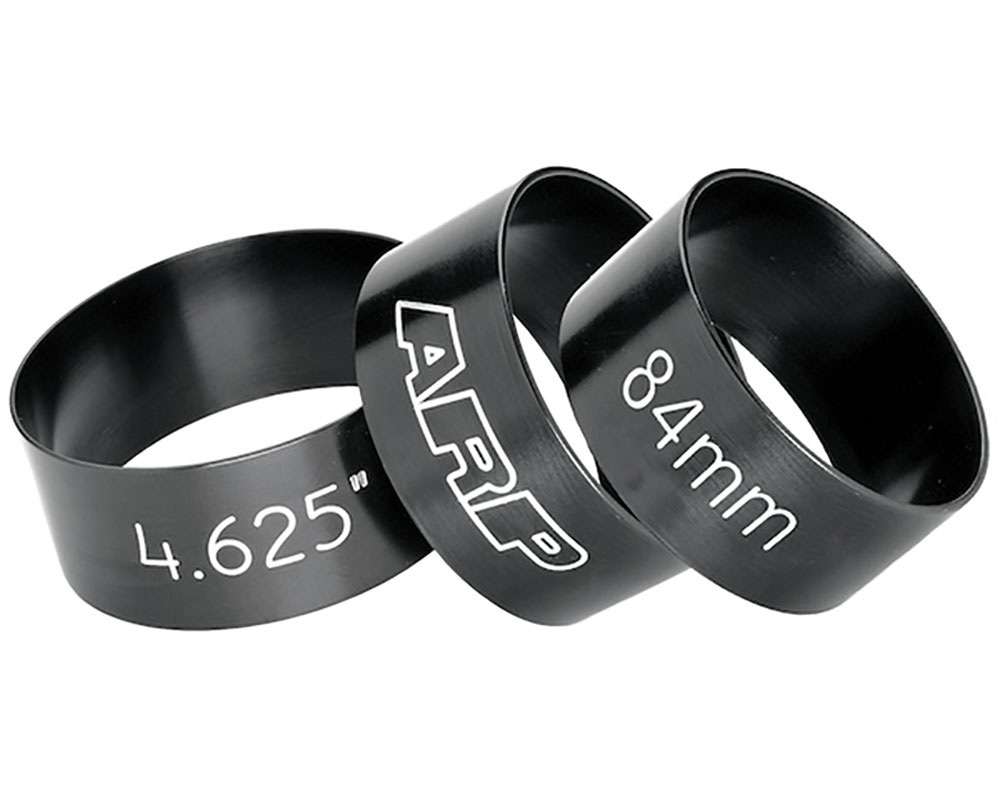 ARP’s ring compressors are CNC machined from 6061-T6 billet tube material and feature a true radius and they are relieved for wire O-rings. Type 3 anodizing is used for long life, and the bore size is prominently engraved for easy identification. Standard stocking sizes from 3.552˝ to 4.750˝ (SAE) and 75mm to 100mm (metric).