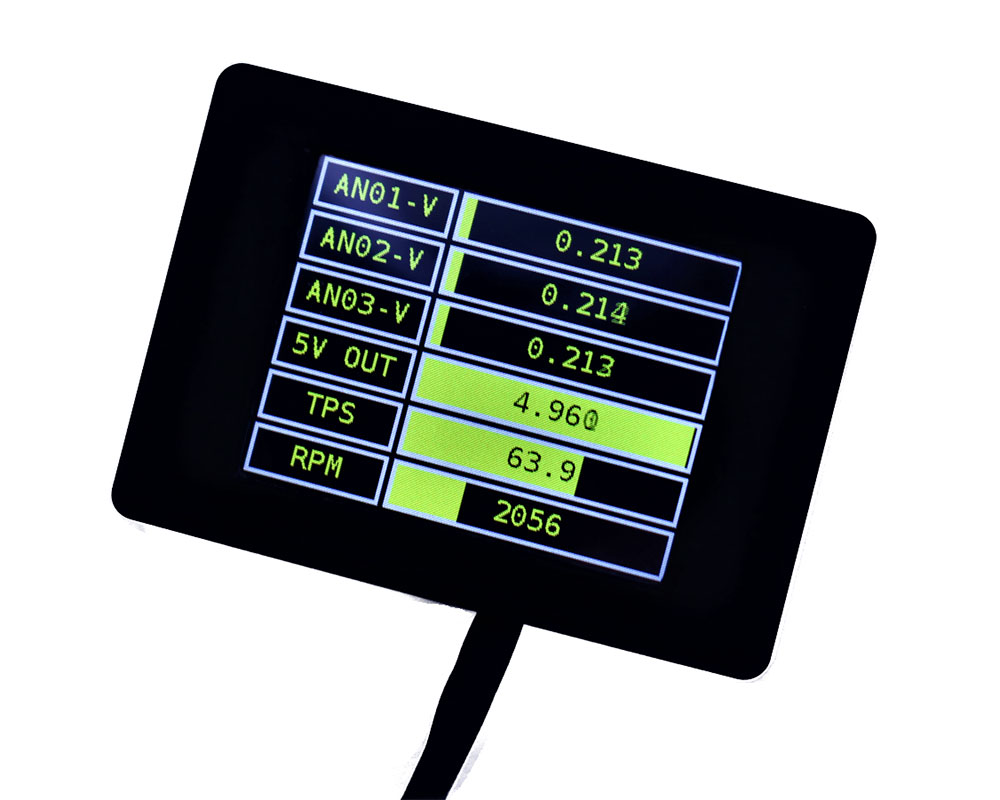 Designed to be used in the harshest environments the TinyDash V2 Includes a pressure resistive touch panel allowing users the ability to change layouts and calibration settings from the panel directly.