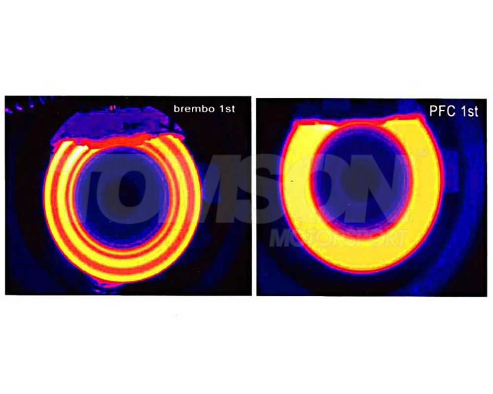 The result is, that PFC brakes out-perform the competition by more efficiently distributing heat for lower lap times, longer and improved driver control. PFC brake discs work so well, that they spread the heat across the surface of the discs and achieve balanced temperature everywhere, whereas tested discs from competitors heat up significantly more on certain areas of the discs than others, which causes unbalanced heat on the disc, crinkling and overall much worse performance and longevity.