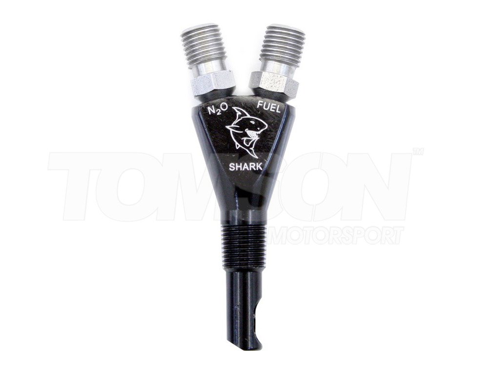Dysza Shark Nozzle wyróżnia się bardzo małym rozmiarem i wykonana jest z anodyzowanego na czarno kutego aluminium. Główne cechy to gwint wkręcany w kolektor o rozmiarze 1/8" NPT, 90° wylot z dyszy oraz stalowe uchwyty na dysze umożliwiające ich zmianę bez niszczenia uchwytu. Opatentowana przez NX dysza Piranha posiada maksymalny przepływ o wydajności do 250 KM oraz doskonałą atomizację mieszanki dla uzyskania jak najlepszych efektów.