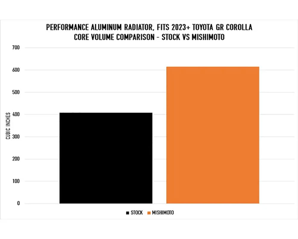 Dzięki aluminiowej konstrukcji chłodnice Mishimoto są o 25% wydajniejsze od seryjnych rozwiązań. Boczne zbiorniki również wykonano z aluminium tak aby zwiększyć powierzchnię odprowadzającą ciepło. Chłodnice Mishimoto są dostępne w wersjach 2 i 3 rdzeniowych, natomiast seryjne chłodnice posiadają tylko 1 rdzeń.