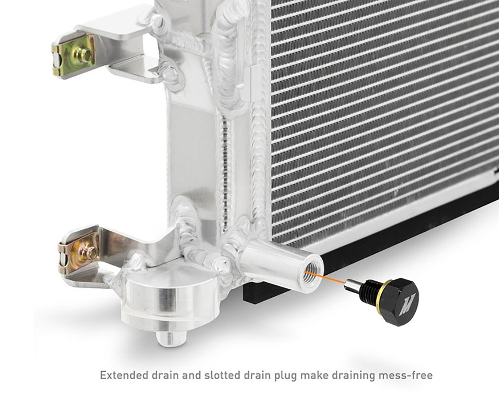 Chłodnice Mishimoto są także wyposażone w magnetyczny korek spustowy, który wyłapuje szkodliwe opiłki metalu znajdujące się w płynie chłodniczym. Zastosowanie korka magnetycznego umożliwia usunięcie zanieczyszczeń  i zmniejsza ryzyko wycieków czy uszkodzeń układu chłodzenia.