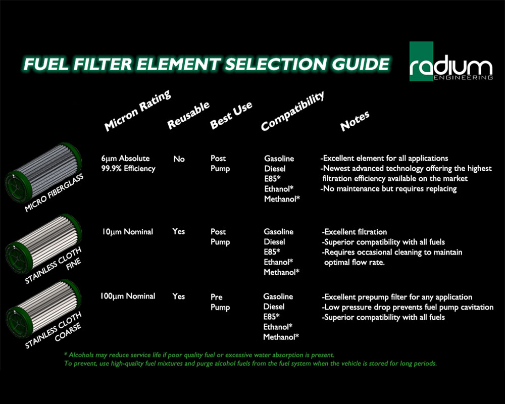 All replacement elements for the Radium fuel filter use anodized aluminum end caps that are laser engraved for easy identification and use an internal FKM O-ring for compatibility with all fuel types. As shown below, they feature a stainless steel internal core to prevent collapsing at high flows.