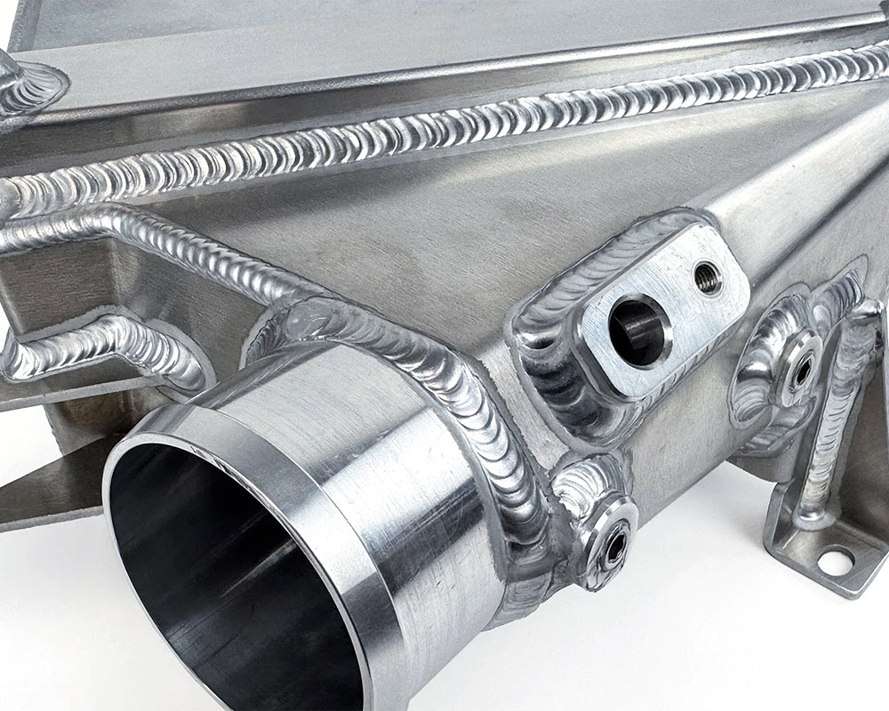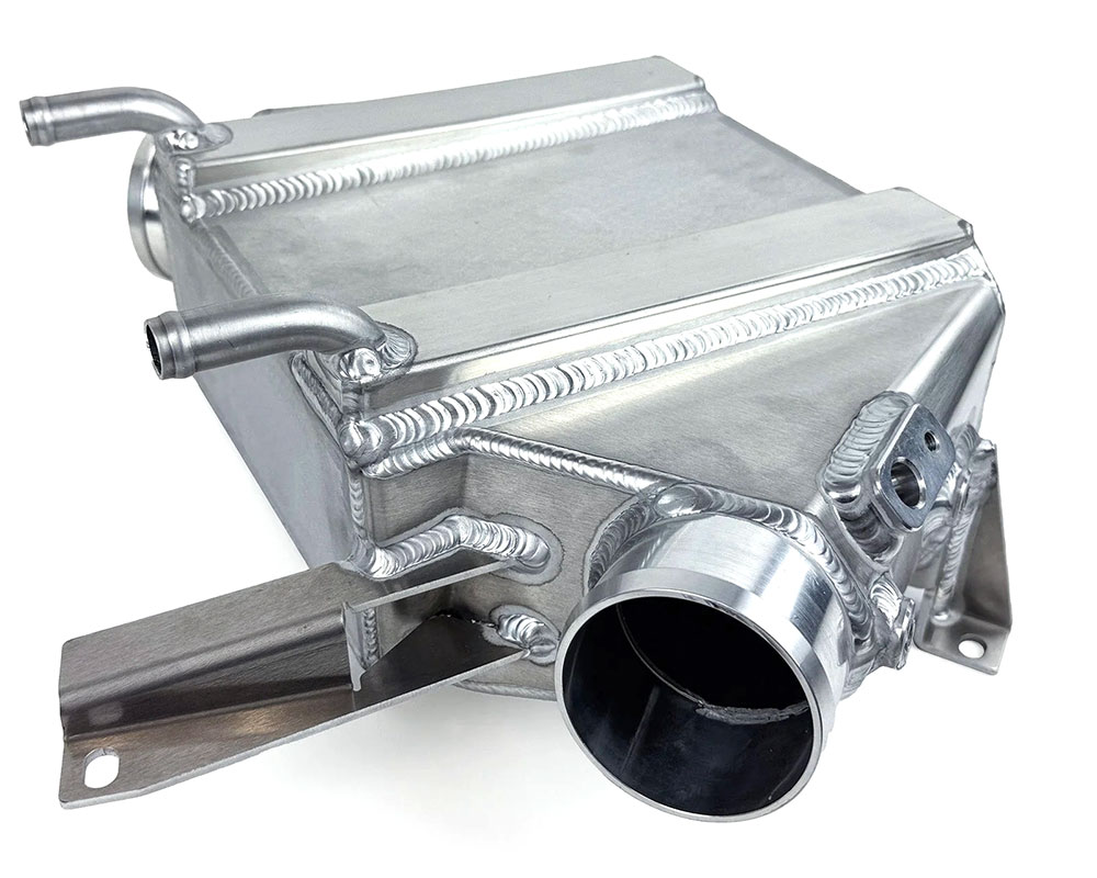 One of the other shortcomings of the factory coolers is their ability to handle high boost. The factory coolers are an all metal construction with extrusion formed tanks brazed to the cores. This is much stronger than the more common plastic tank with crimped-on gasket seals, but it still leaves room for improvement. The brazed joint is still a weak spot in the system and can burst at higher boost pressures. The new CSF Charge-Air-Coolers fully TIG welded the all aluminum tanks to the cores. This construction method offers the strongest possible coolers that will handle much higher boost pressures than the factory coolers.